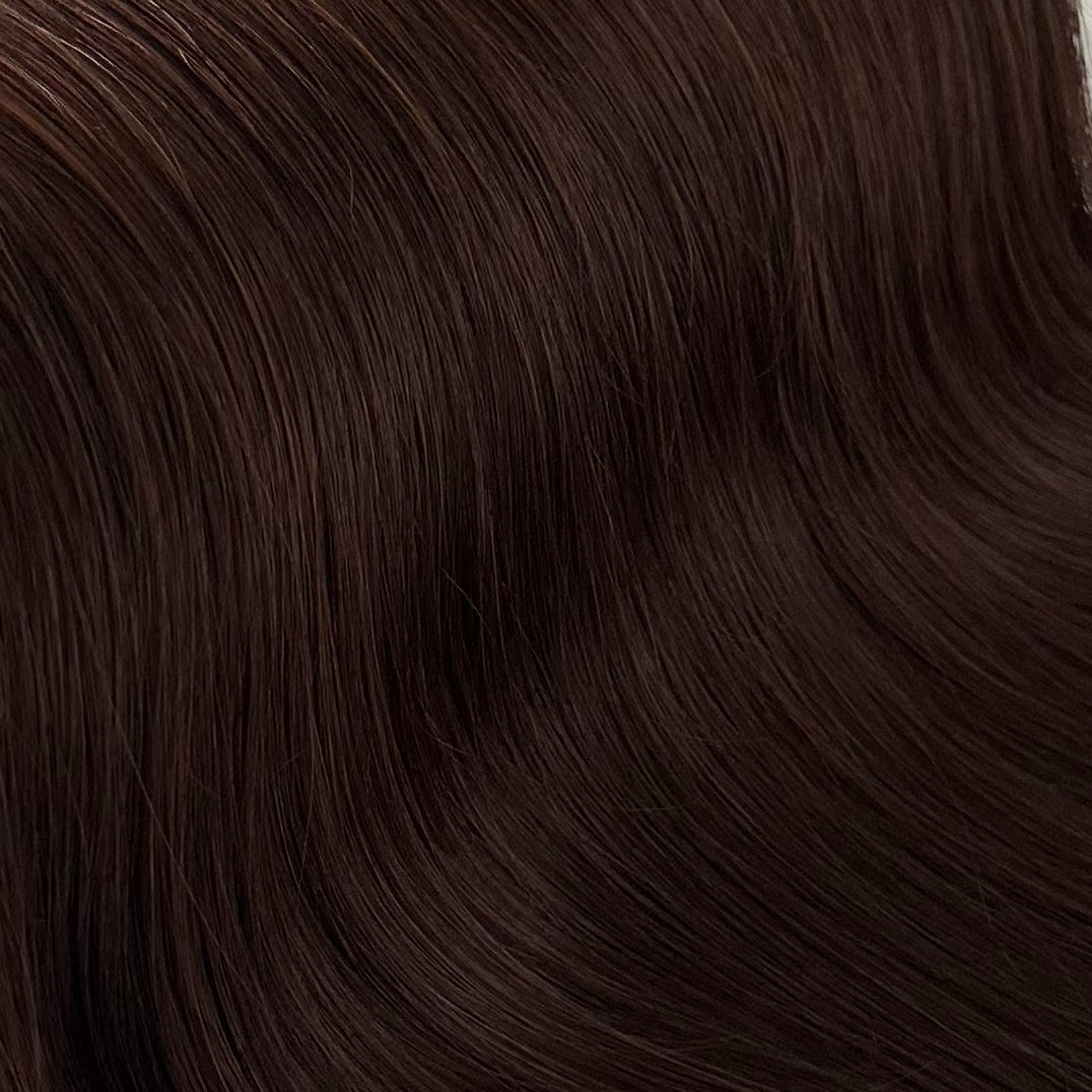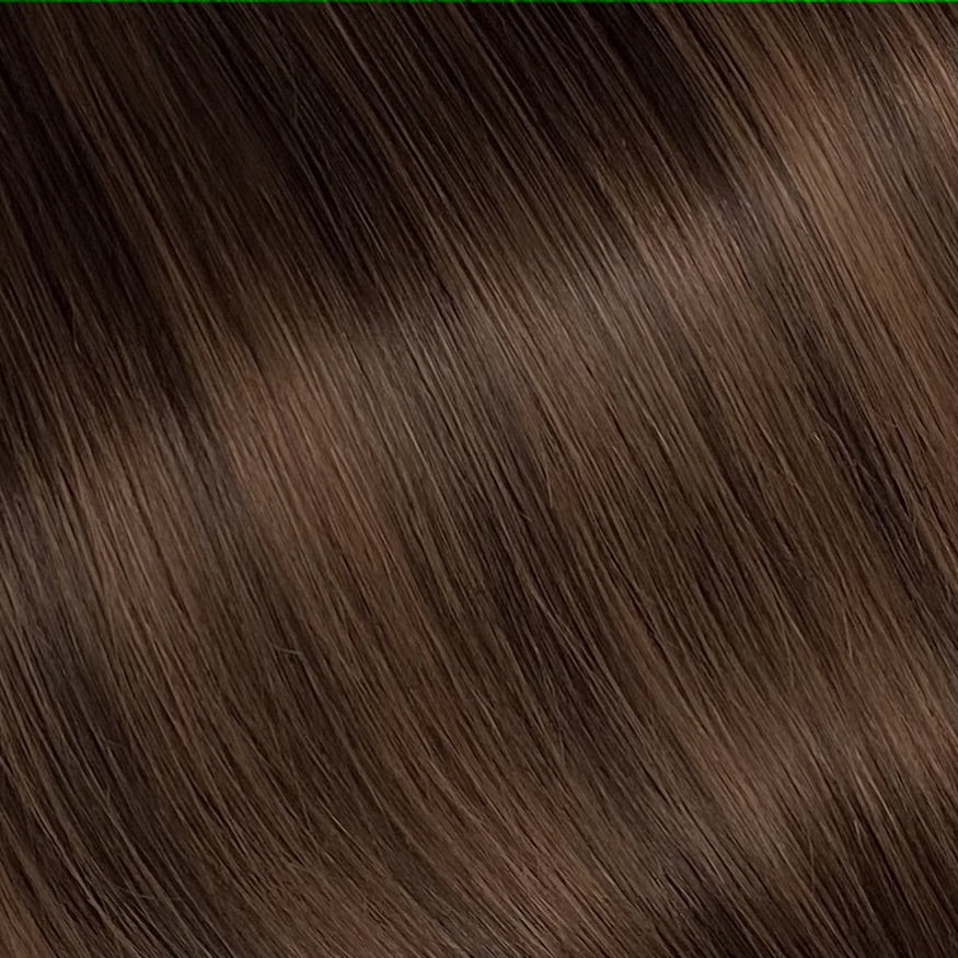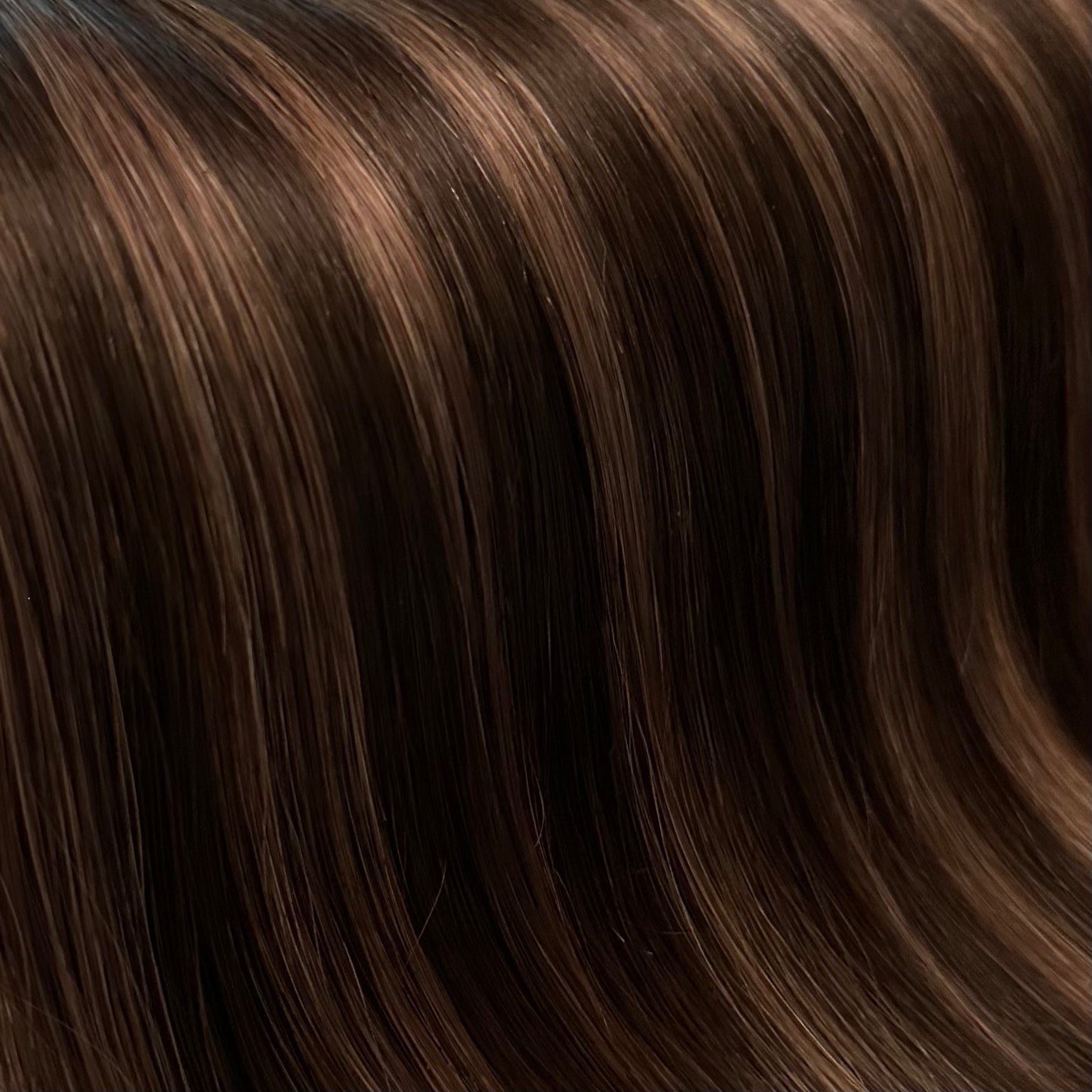 Espresso features a root balayage with rich dark brown and reddish-brown highlights, adding warmth and dimension.