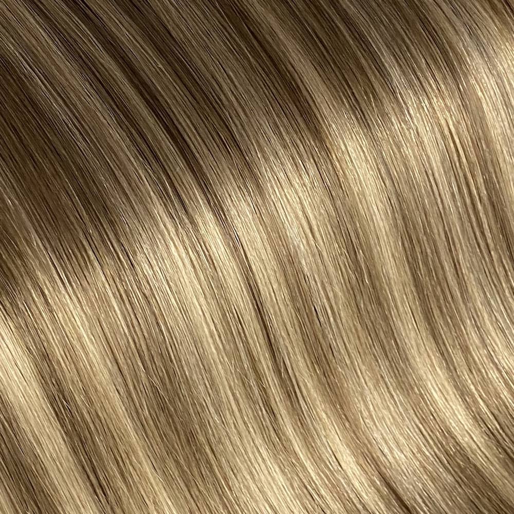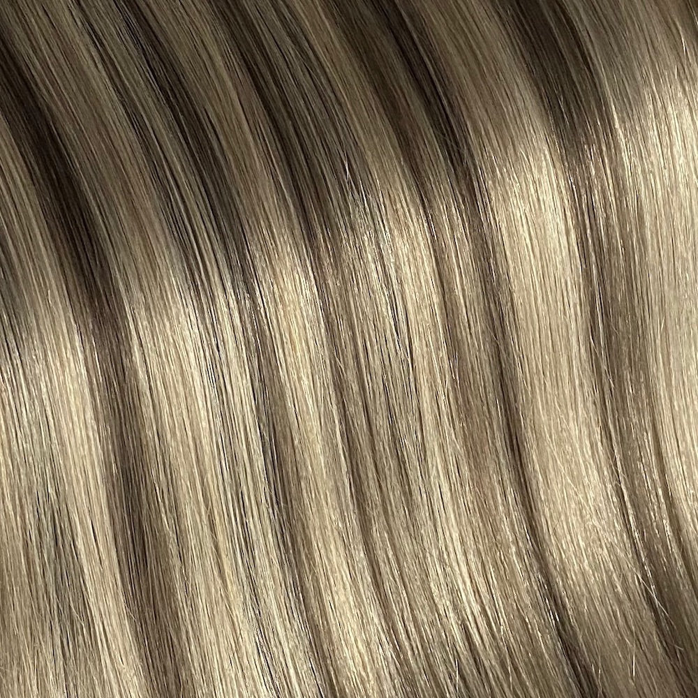Caramel features a root balayage, blending warm and cool tones on a dark blonde base for a multidimensional effect.